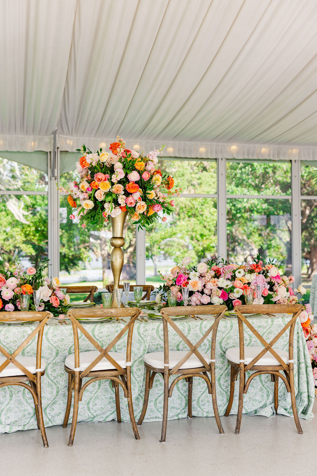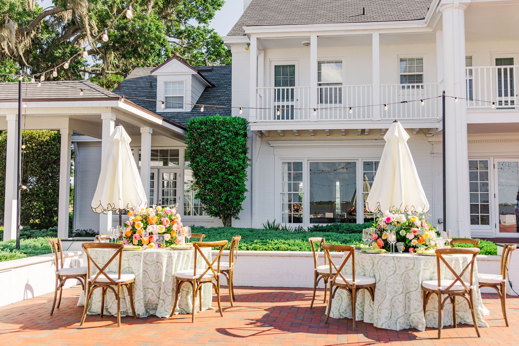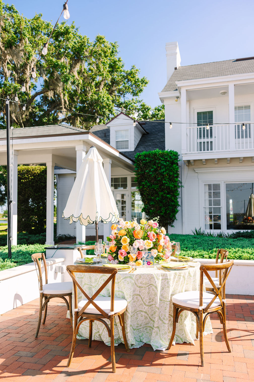 The French Country Chairs from A Chair Affair truly defined the aesthetic of the shoot. Consequently, these chairs immediately introduce a relaxed, yet elegant, European farmhouse flair. Their natural wood finish and delicate, spindle backs provide the ideal balance between rustic texture and polished design. They offered comfortable, inviting seating for the long, banquet-style tables set up under the outdoor tent. Ultimately, the French Country Chairs are a favorite choice for Florida brides seeking to blend sophistication with the casual beauty of an outdoor setting.
