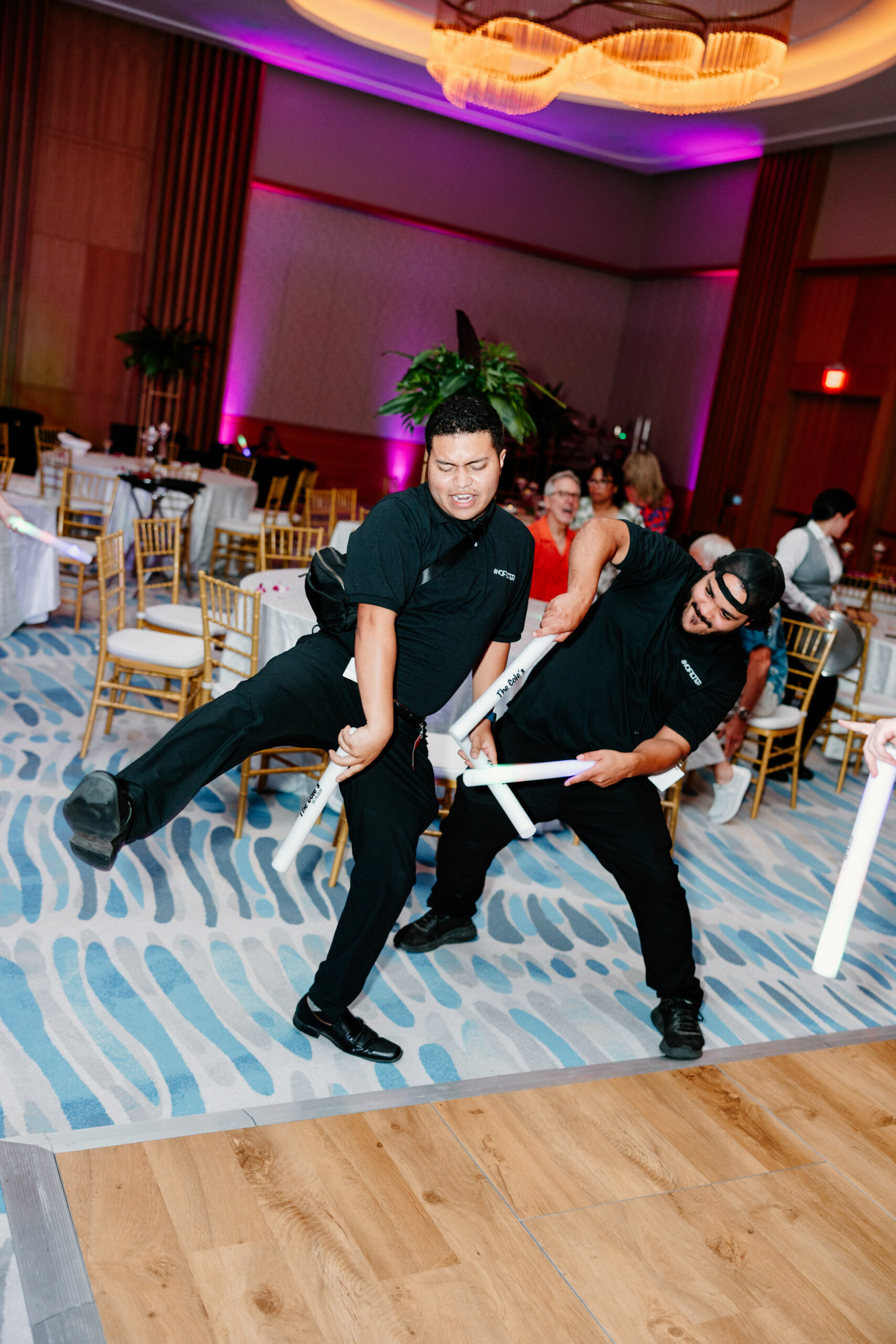 In one of the most memorable moments of the night, the bride and groom joined the performers on stage to play trash-can drums—a high-energy nod to street performers that surprised and delighted everyone. With glow sticks in hand and Best in Brass providing a soulful music quintet earlier in the day, the auditory experience was just as vibrant as the visual one.