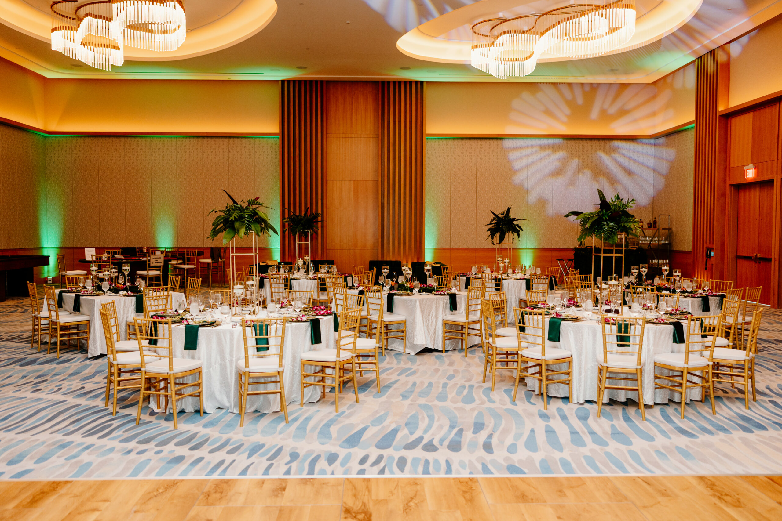 Additionally, the rich, forest-green napkins from Over the Top Linen provided a bold pop of color against the white linens. Furthermore, Get Lit Productions utilized strategic lighting to make the gold accents glow, creating an atmosphere that felt both intimate and grand. These details ensured that when guests sat down for dinner, they felt immersed in a five-star dining experience.