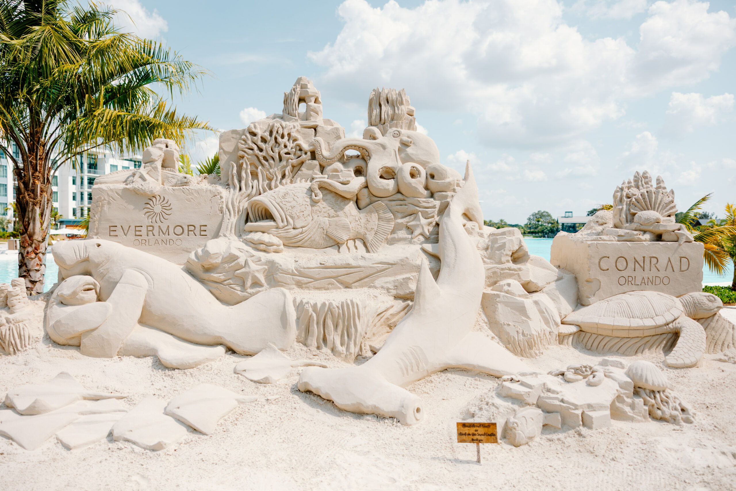 Aerie view of ceremony site at The Conrad Orlando and EverMore resort. Orlando Weddings. Orlando Wedding Rentals. Giant sandcastle sculpture at Evermore Resort in Orlando. Orlando Wedding Rentals. Orlando Weddings Green hedge backdrop and mirrored seating chart. Orlando wedding Rentals.