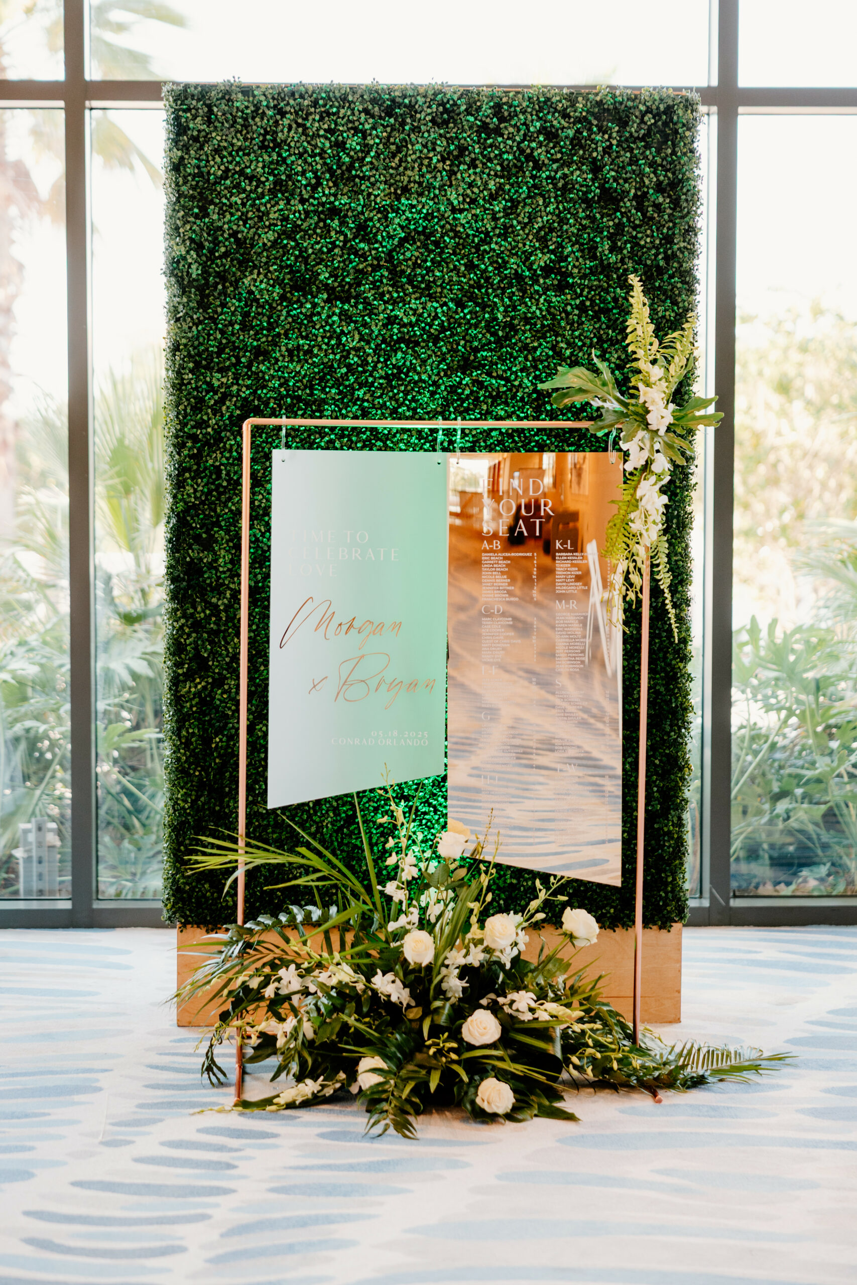To start the experience, a custom seating chart was displayed against lush Hedge Walls from GALA Event Rentals. Therefore, this organic backdrop perfectly complemented the tropical greenery provided by CDC Floral. It set a sophisticated tone right from the entrance, signaling that this was no ordinary reception.
