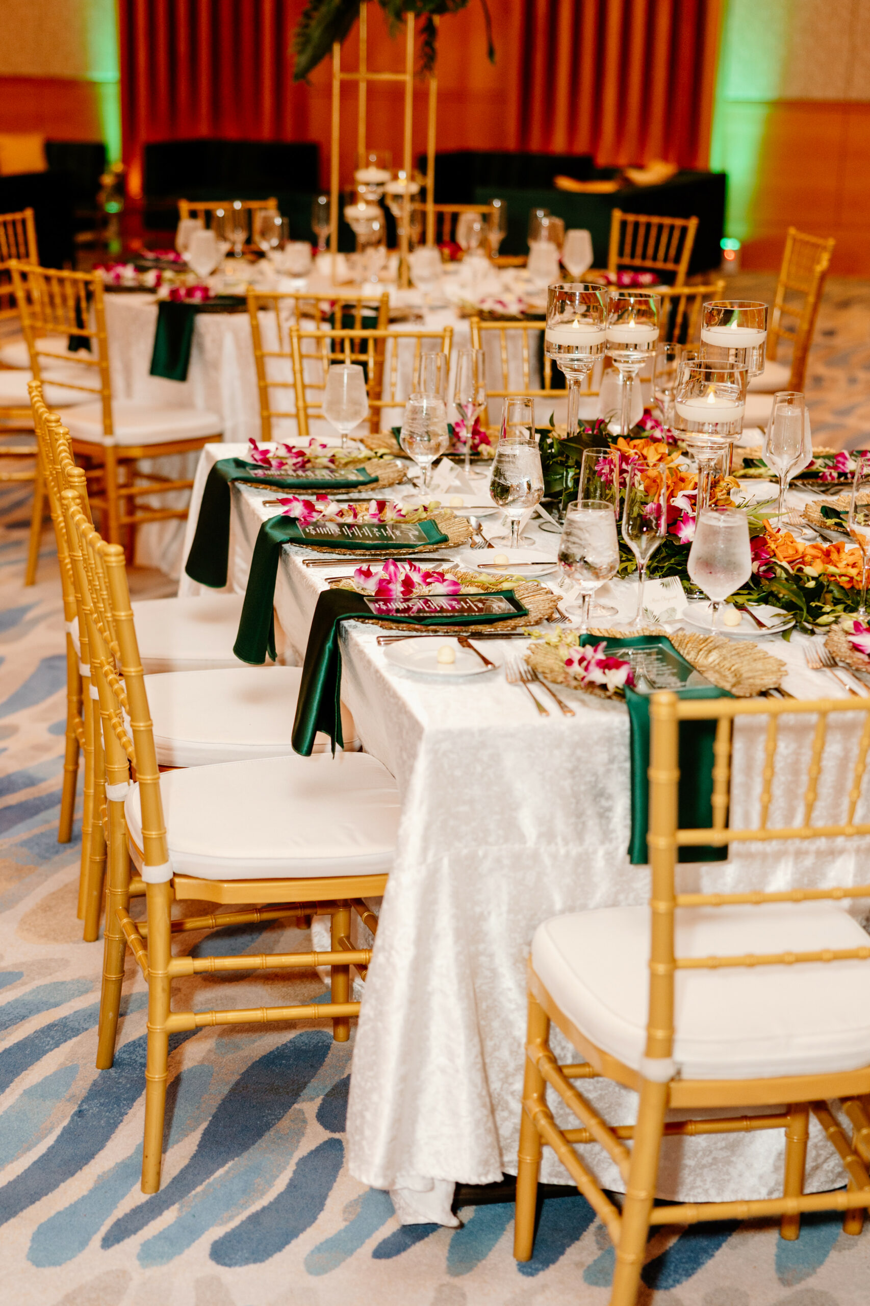 Room overview at reception with gold chairs, white tablecloths and emerald linen. Orlando Wedding Rentals Table close up with gold seafoam chargers provided by A Chair Affair. Orlando Charger Rental. Orlando wedding Rentals