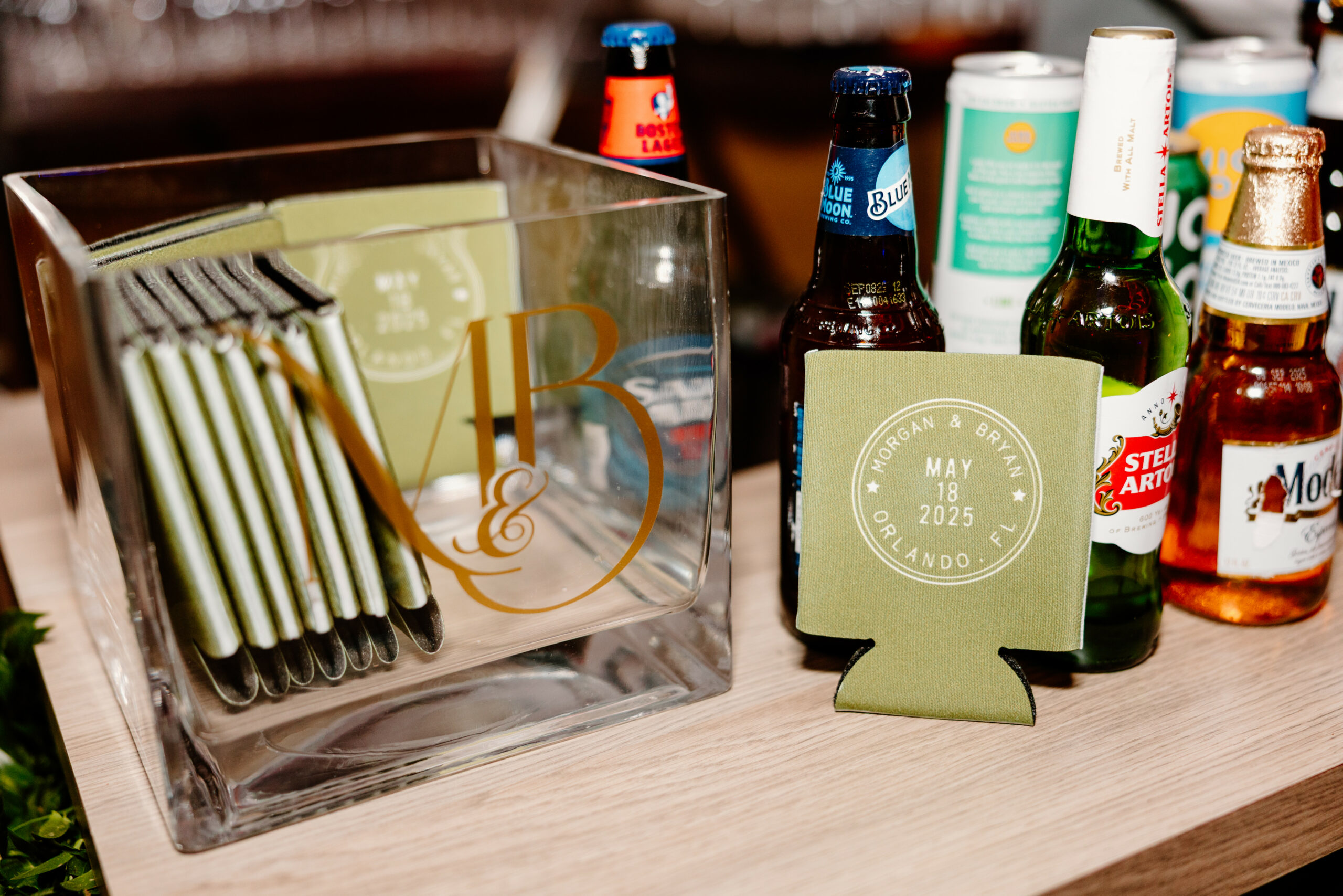 Casino table at reception. Orlando Casino Rentals. Orlando Wedding Rentals Green Koozies provided to guests. Orlando wedding Rentals