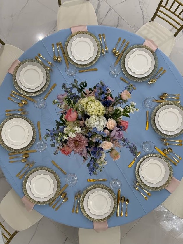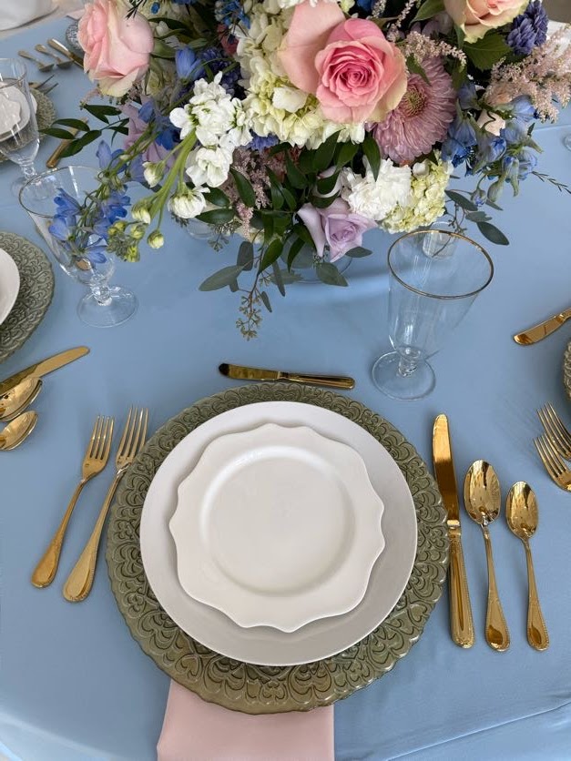 Next, we layered the plates. The refined Charming Dinner and Salad Plates introduced classic white elegance, providing a crisp contrast to the metallic chargers. Moreover, the elegant place settings were completed with our Euro Flatware, whose sleek, polished design ensured every element felt contemporary and high-quality.