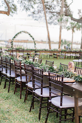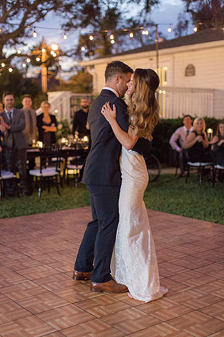An outdoor reception under the stars is truly a magical way to celebrate your night. The backyard at the Bed & Breakfast had long tables shaped out into a U, with the wooden dancefloor at the center of it all. Situated along the tables were our Mahogany Chiavari Chairs and White Pads. The centerpieces included long strands of greenery and candles in votive holders placed throughout. It was a simple yet very elegant look. Once everyone took their seats dinner was served. Followed by toasts given to the newlyweds. Then as the sun was starting to set Dustin pulled his bride to the dancefloor for their first dance. Under the twinkling lights, the two swayed to the music as they gazed into each other eyes and soaked in the moment. After, the band started and you couldn’t keep the guests off the dancefloor. Everyone danced and partied the rest of the night away.