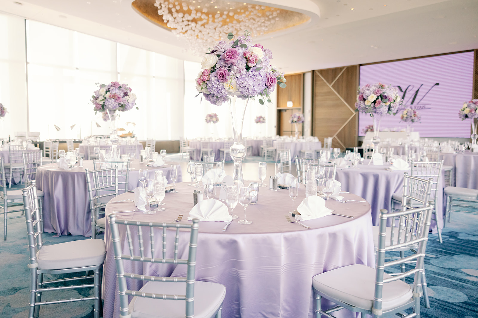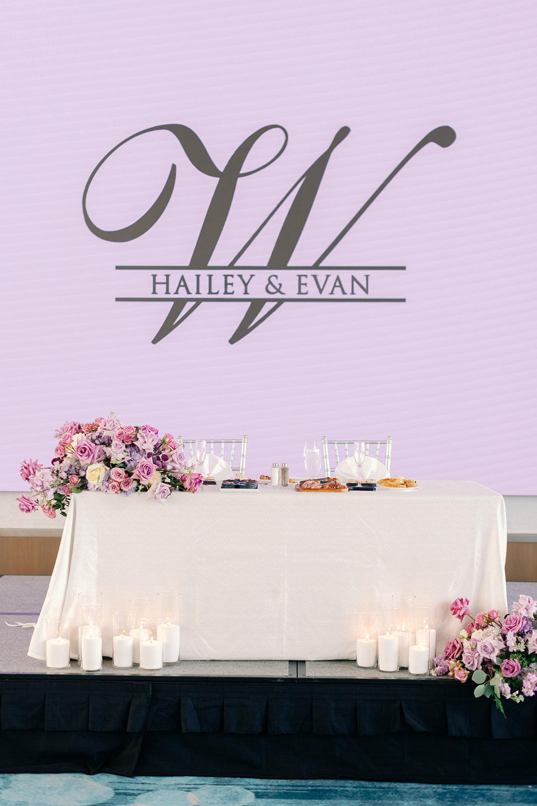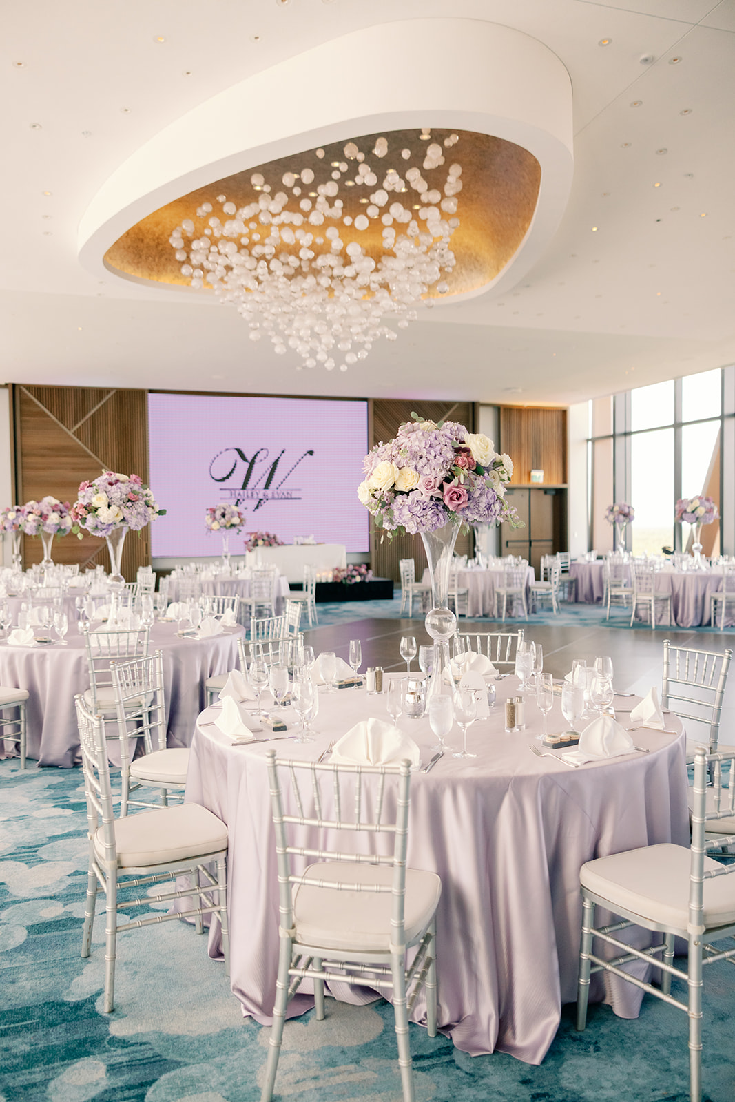 These chairs acted as the perfect metallic accent against the soft lavender and purple linens provided by Over the Top. Thus, the silver finish captured the ambient light of the ballroom. Adding a glimmer of luxury that complemented the vibrant, lush floral arrangements by Emerald Gardenia. Throughout the evening, the House of Sheen Glam Team ensured Hailey remained camera-ready. While Lori Loftis Productions handled the steaming and wardrobe preparation so every fabric draped perfectly.