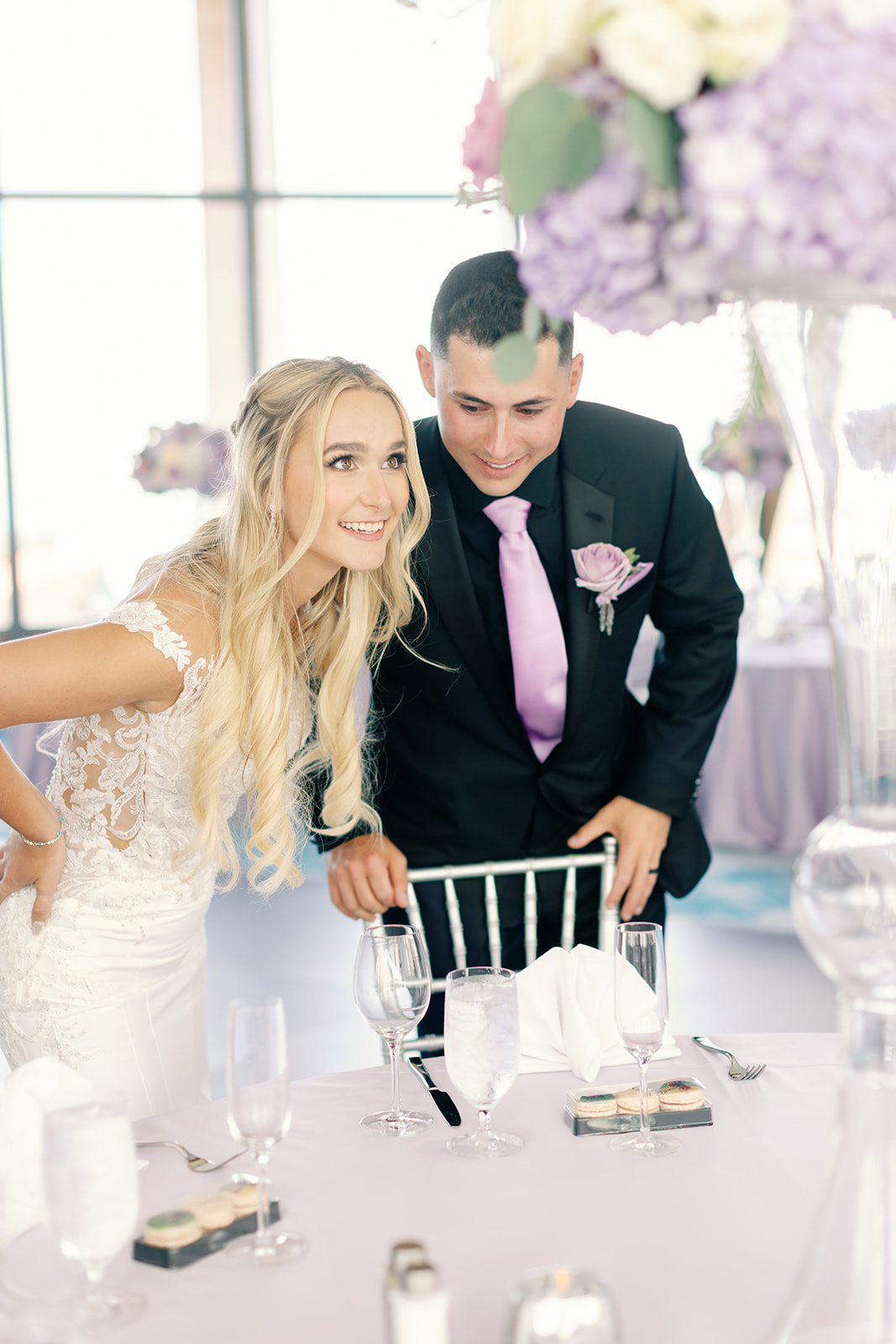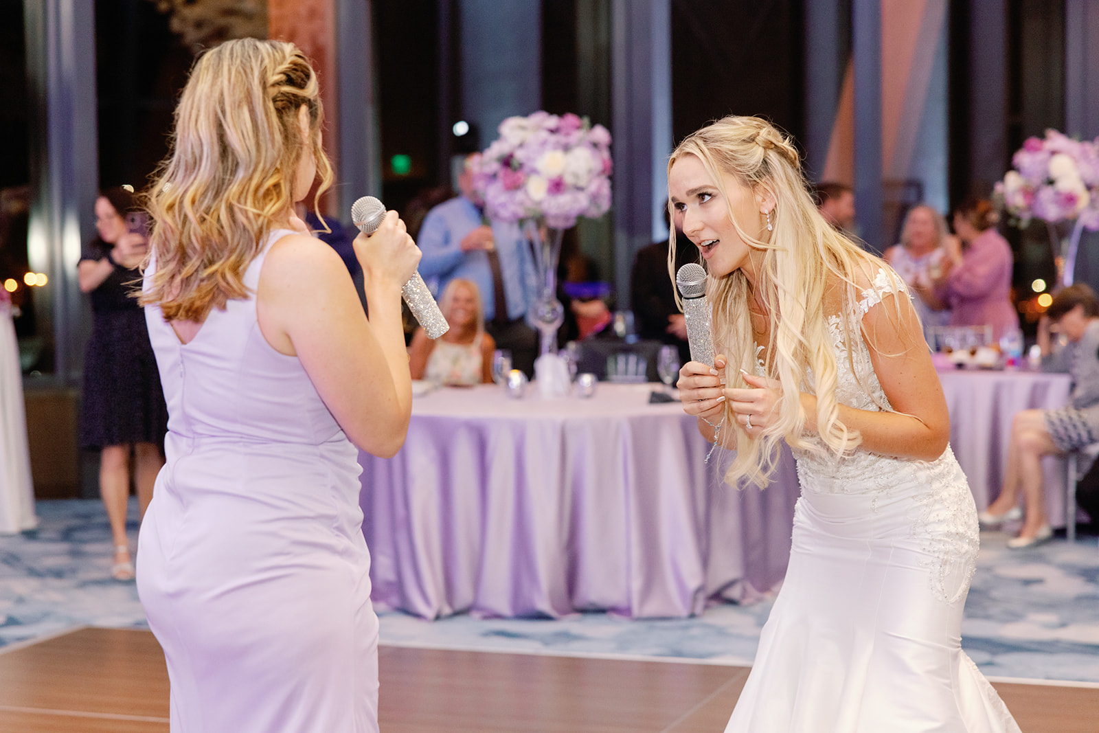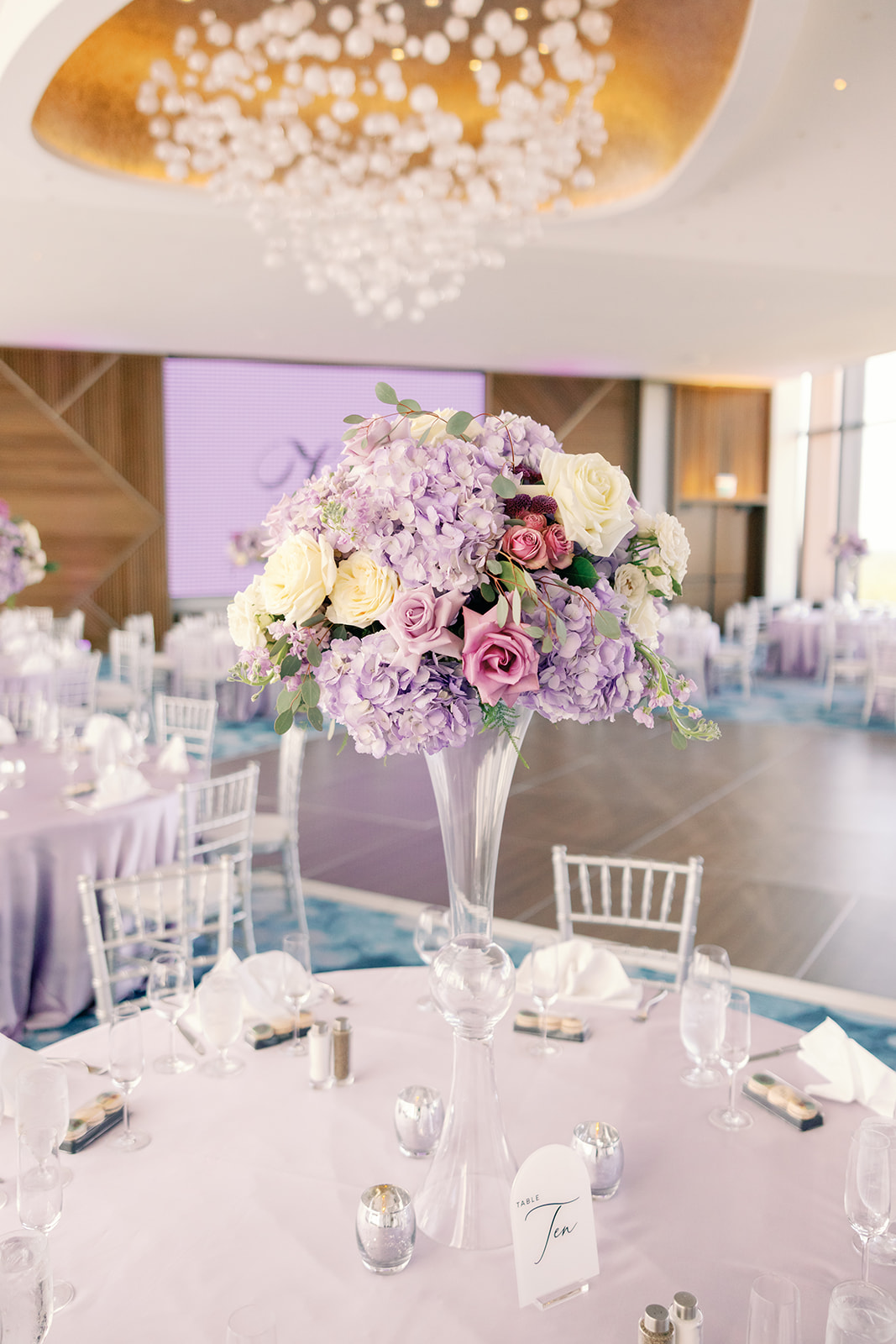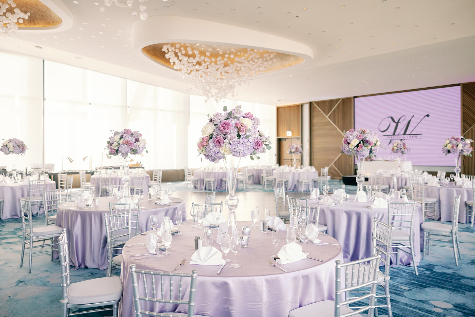 These chairs acted as the perfect metallic accent against the soft lavender and purple linens provided by Over the Top. Thus, the silver finish captured the ambient light of the ballroom. Adding a glimmer of luxury that complemented the vibrant, lush floral arrangements by Emerald Gardenia. Throughout the evening, the House of Sheen Glam Team ensured Hailey remained camera-ready. While Lori Loftis Productions handled the steaming and wardrobe preparation so every fabric draped perfectly.