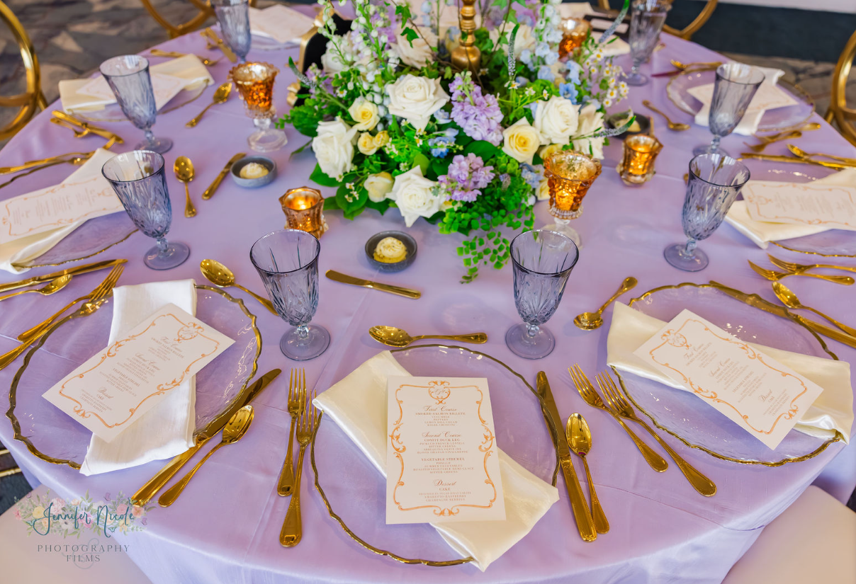 The tablescape design demanded items that spoke to sophisticated taste while remaining current. A Chair Affair provided specific, high-impact pieces that elevated the dining experience and showcased contemporary event rental trends. We supplied the Silver Octo Chargers, whose unique detailing introduced texture and a refined metallic accent to the setting, effortlessly framing the dinner plates. In addition, the Gatsby Flatware provided a touch of Art Deco glamour, offering a sophisticated contrast against the modern plates. By utilizing the Matte Black Dinner and Salad Plates, the tablescape achieved an immediate sense of modern chic.